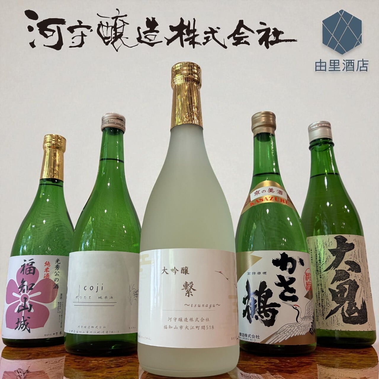 1【大吟醸 繋〜tsunagu〜】 『香りは華やかに、余韻はしとやかに。』 厳選された酒米を贅沢に磨き上げ、じっくりと醸した大吟醸。まるで宝石のように澄み切った味わいと華やかな香りが、特別な一杯を演出します。 2【搾りたて純米酒 coji】 『米の息吹を感じる、瞬間の贅沢。』 しぼりたての勢いをそのまま閉じ込めた、フレッシュで躍動感のある一本。口に広がるのは、米の旨味と爽やかな香りが織りなす透明感あふれる味わい。雑味のないクリアな飲み口は、食事と寄り添いながらも存在感を放ちます。日常の一杯を洗練されたひとときに変える、モダンな純米酒。 3【上撰 かさ鶴】 『330年の時を超えて愛される、すっきり辛口。』 創業330年の歴史を誇る河守醸造。その歩みとともに受け継がれてきた、最も古い銘柄が「上撰 かさ鶴 」です。 伝統の技と時代を超えて愛されてきた味わいは、すっきりとした辛口。口に含めば雑味のないクリアな飲み口が広がり、スルスルと盃が進む軽快さが魅力です。 長い歴史に裏打ちされた安心感と、現代の食卓にも寄り添う飲みやすさ。 4【光秀公の酒 純米酒 福知山城】 『光秀公ゆかりの城下町から生まれた、辛口純米酒。』 戦国武将・明智光秀公ゆかりの地、福知山に誕生した純米酒。2021年に放送された大河ドラマ「麒麟がくる」を契機に誕生したこのお酒は、ふくよかな米の甘みと旨味を感じつつ、後味はすっきりと引き締まる辛口が特徴です。福知山観光協会推奨土産品にも認定されており、歴史ファンや観光のお土産としても人気の一本。城下町・福知山の誇りを盃に込めた、物語性あふれる純米酒。 5【原酒 純米吟醸 生酒 大鬼】 『辛口の爽快感、大鬼の一献。』 「大鬼」は平成8年(1996年)に京都府福知山市大江町で結成された、町おこしプロジェクト「大江で地酒を造る会」の方たちが日本の棚田百選の毛原で栽培した酒米「五百万石」を賛同頂いたハクレイ酒造に醸造を依頼して誕生。以来29年間に渡って福知山市大江町で愛されている酒銘。
